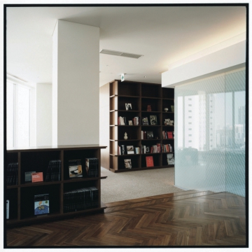 FIXサッシを多用した近代的で透明感のある外観とはまた違い、一歩足を踏み入れると温かみの強い落ち着いた空間デザイン。